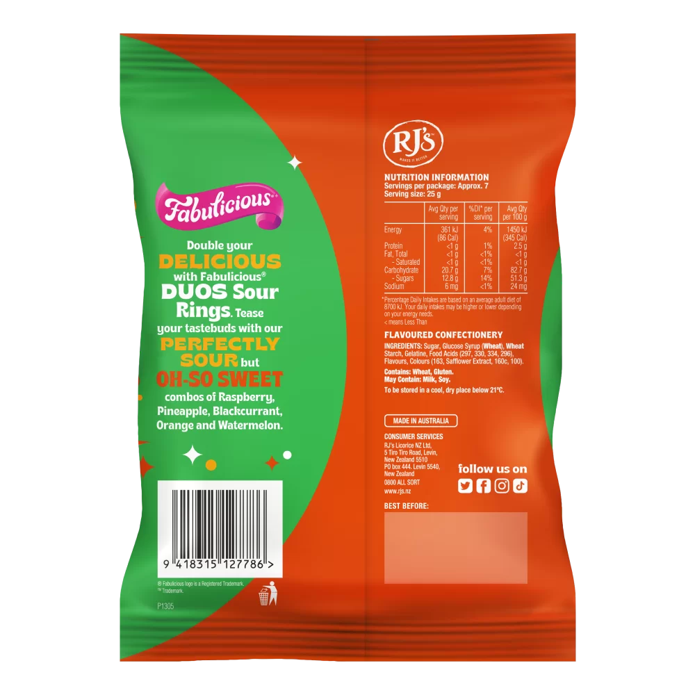 Double your delicious with Fabulicious® Duos Sour Rings. Tease your tastebuds with our perfectly sour but oh-so sweet combos of Raspberry, Pineapple, Blackcurrant, Orange and Watermelon.