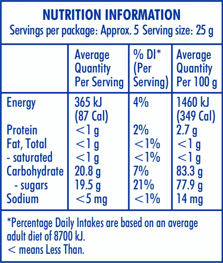 Sugar, Glucose Syrup, Water, Invert Sugar, Gelatine, Natural Flavour, Natural Colour (100).